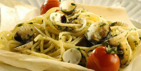 Colocar o vôngole com as conchas já escovadas numa panela coberto com água e uma colher de azeite. Ferver até abrir. Refogar a cebola com a outra colher de zeite, juntar os tomates, o sal, o caldo onde cozinhou o vôngole, o manjericão, deixando ferver por 30 minutos. Retirar o vôngole das conchas abertas e refogá-lo na manteiga. Acrescentar o vinho e o molho de tomates. Ferver por 10 minutos. Cozinhar o espaguete numa panela com água fervente al dente. Escorrer e servir com o molho, salpicar com salsinha picada.