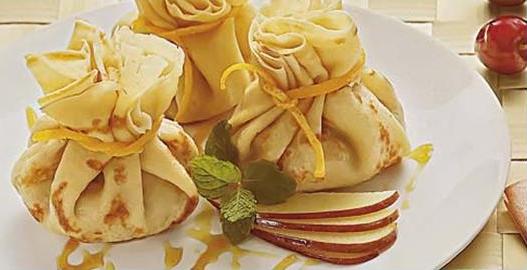 Recheie os crepes e feche como uma trouxinha. Amarre com a tirinha de laranja. Sirva com a calda de caramelo e maçãs cortadas em fatias finas.