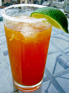 Misture o sal com o chili em pó e passe na borda de um copo alto. Pingue quatro gotas de tabasco e quatro de molho inglês no copo. Adicione as pedras de gelo e o suco de limão. Complete com cerveja.
